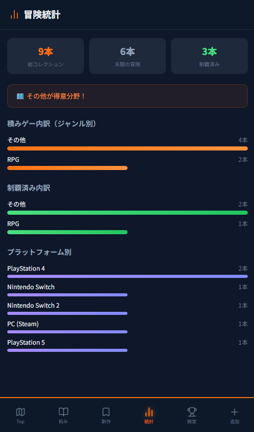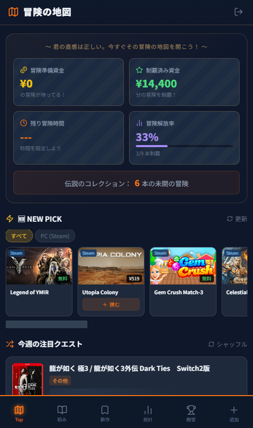 「積みゲー」を罪悪感ではなく、まだ見ぬ冒険への期待として管理するゲームバックログアプリ。Backlog → Playing → Cleared で自分だけの冒険記録を残そう。